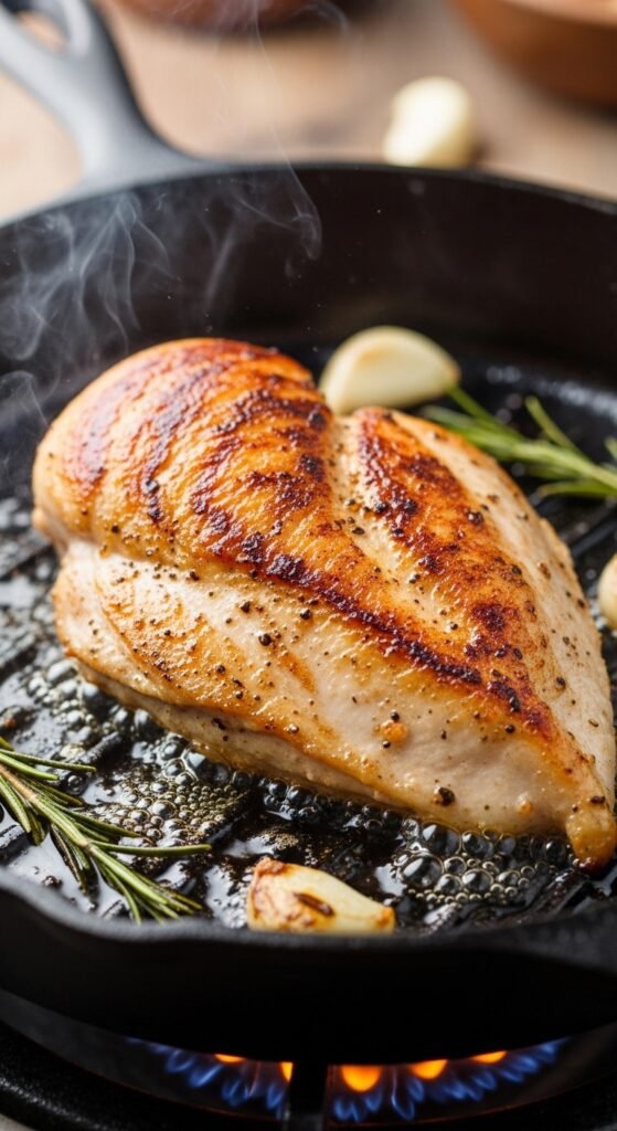 2. Place the chicken in the pan: Make sure the skin side is down if you’re using bone-in chicken. Let it sear for 4-5 minutes without moving it.