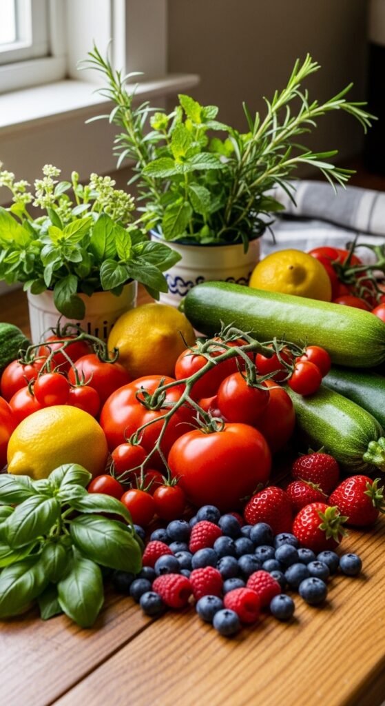 - Fresh berries, peaches, and citrus